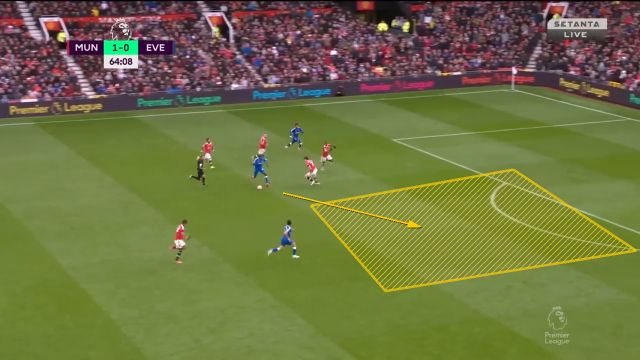 1) Роль МакТоминея в атаке. Мы знаем, что Скотти в академии долгое время играл роль форварда, в то время как в первой команде его больше используют в роли опорника. В отдельных матчах прошлого сезона (6-2 с Лидсом, 9-0 с Саутгемтоном) Оле просил МакТоминея подниматься выше для поддержки и даже завершения атак. Так происходило и в первом матче против Лидса, и после возвращения шотландца на поле, ниже пара скриншотов из игры с Эвертоном. Видно, что шотландец является дополнительной атакующей единицей, способной и пробить издали, и войти в штрафную площадь.