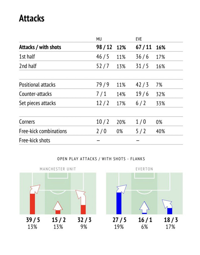 В матче против "ирисок" у Юнайтед было вдвое больше ударов в створ в каждом из таймов, но по-настоящему опасным стали лишь удары Марсьяля и Кавани, среди них и забитый мяч. По xG соперники почти равны, так что исход встречи можно считать справедливым, Манчестер не создавал угрозы, имея на поле одну из лучших атакующих групп в АПЛ. Помимо этого, 10 угловых у ворот Эвертона закончились ничем. Это - открытые вопросы в адрес тренерского штаба.